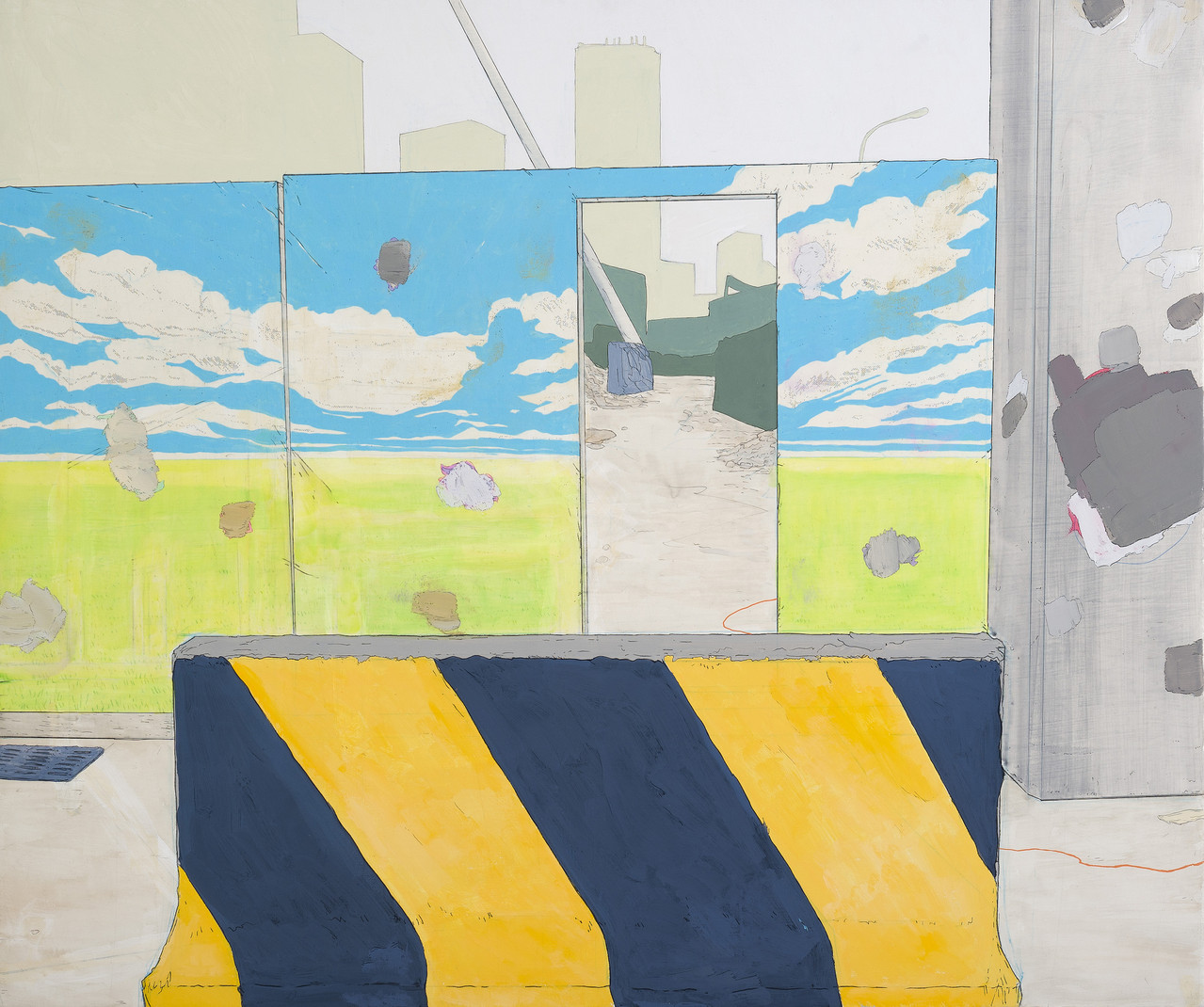Amze Emmons has built this unlikely cityscape by collaging images from newspaper clippings and his own street photography to make the strange familiar. Acrylic, graphite, polymer-based gouache on canvas over panels were used in these pieces. The mix of bright colors and muted hues, painterly marks, and graphic lines invite the viewer to look closer and linger on scenes they might have overlooked in the news feed or their daily commute.