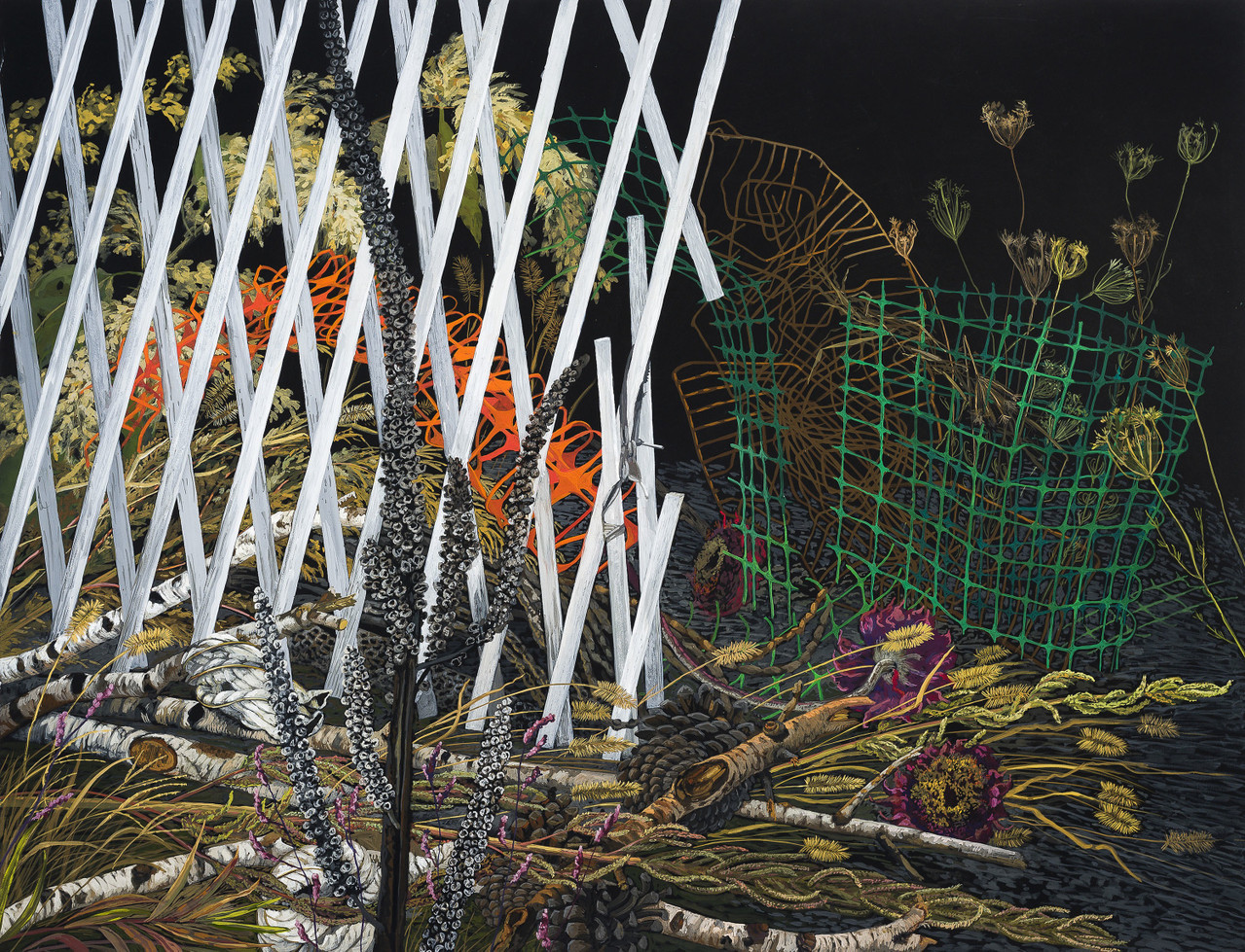 Joan Wadleigh Curran is interested in objects that exist on the periphery of our daily experiences and are often overlooked. Wadleigh Curran focuses on moments when vegetation and human material merge, producing visual contradiction. Cropped, pruned, and twisted forms of plant and man-made objects co-exist in her unsettling paintings and drawings that explore growth and decay, regeneration and reclamation.